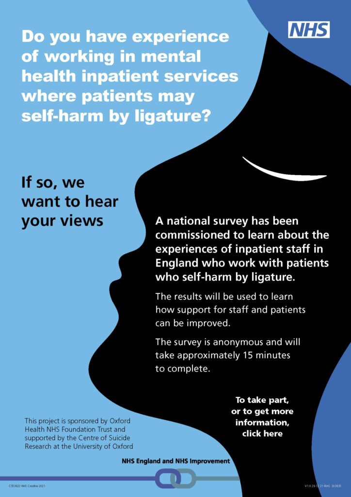 This national survey aims to understand the current experiences that staff have regarding working with patients who self-harm by ligature within inpatient services. This includes the impact that this work has on staff. We aim to use the results to inform future methods to improve support for staff and patients.